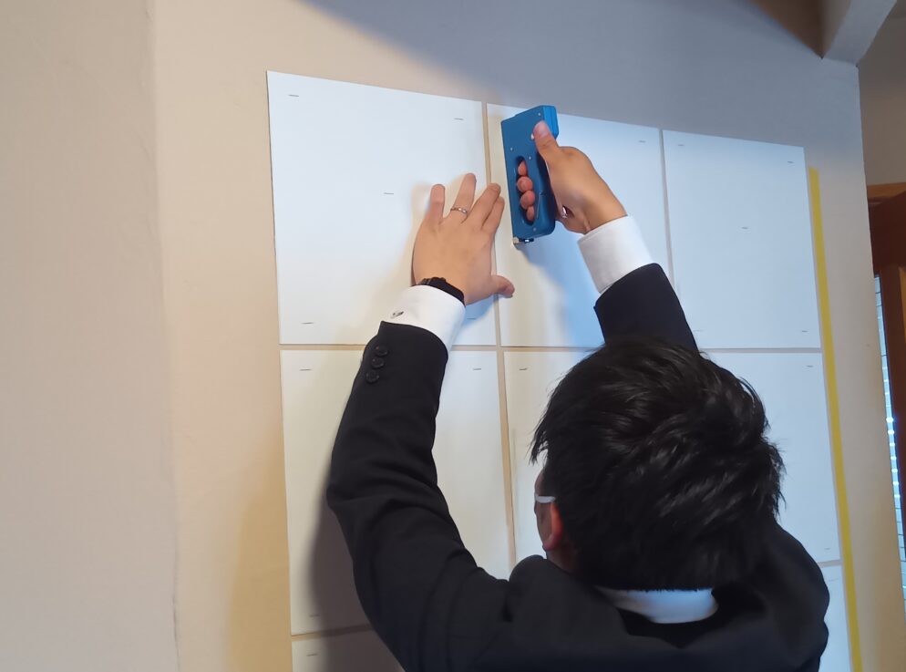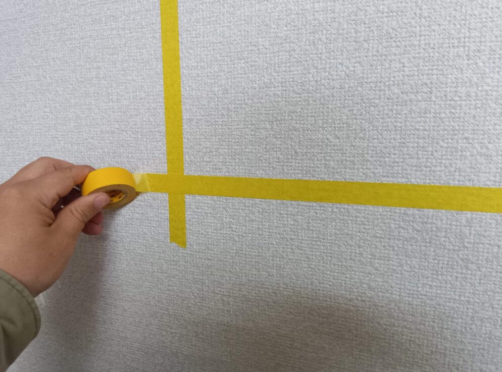 ①取付る壁面にマスキングテープを用いて配置を決めます。水平をきちっと出す作業がエコカラットセルフを取りけるにあたり一番難しい作業かもしれません。壁面に凹凸があると仕上がった際に不陸が生じますのでクロスの壁などフラットな面を推奨します。