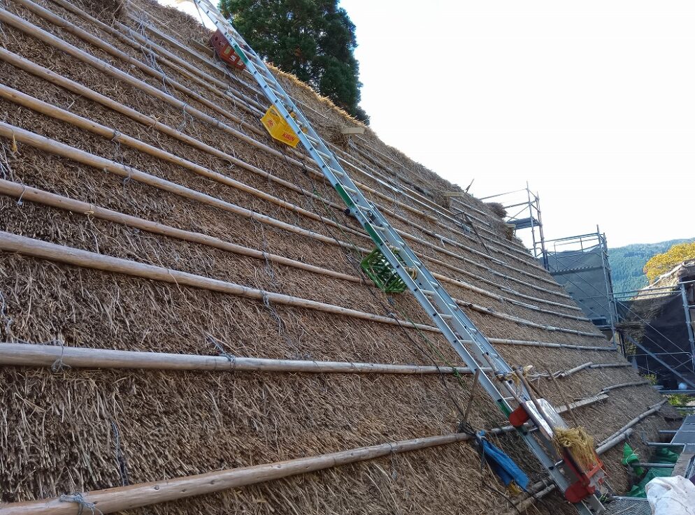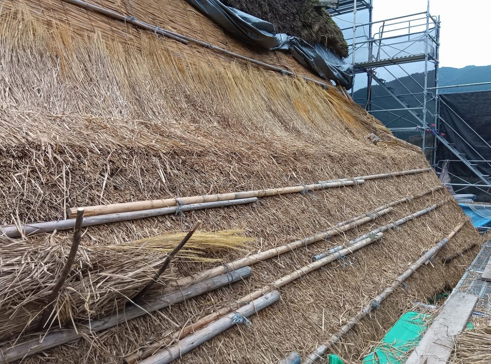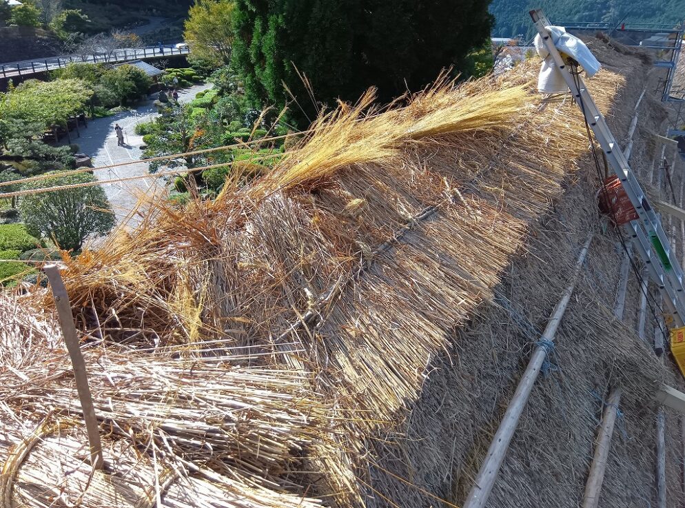 只今、下呂温泉合掌村にて屋根茅の葺替えをさせていただいております。