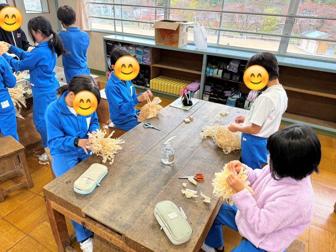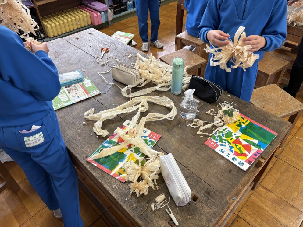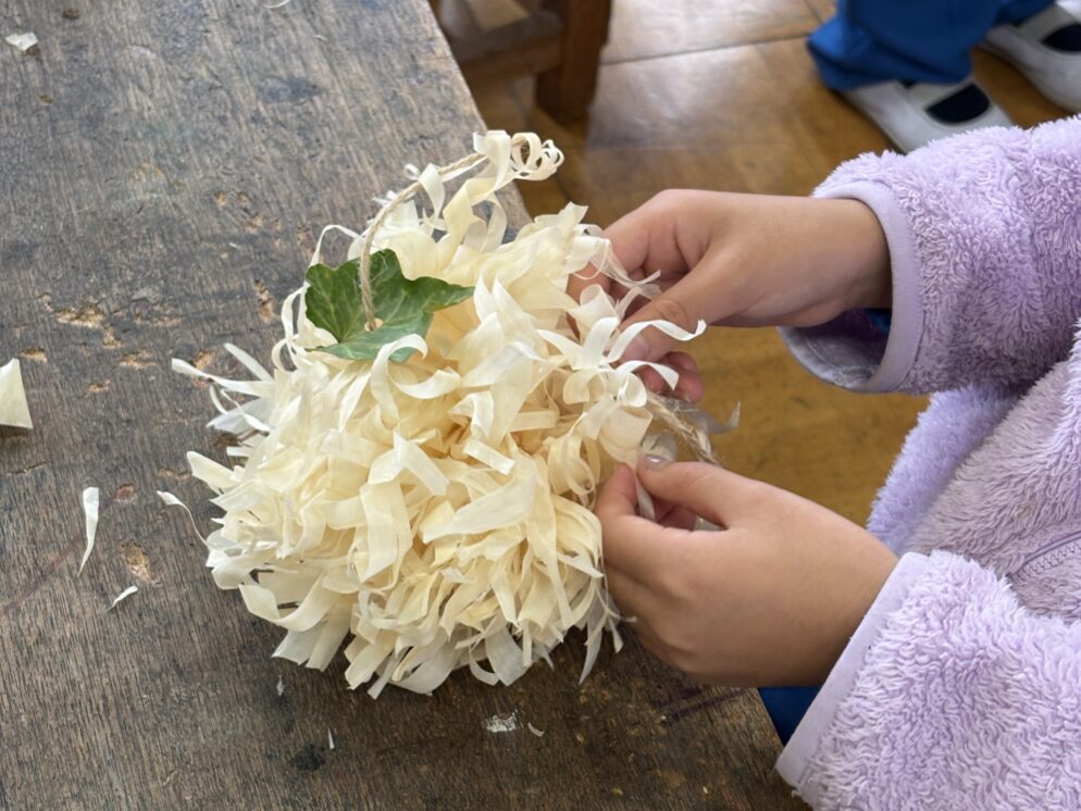最後は、かんなくずのボンボンづくり。かんなくずならではの木の質感や香りを感じながら、説明を聞いたあと製作スタート。木のあたたかさに触れながら形を工夫したり、友だちと見せ合ったりと、創造力を発揮してくれました。