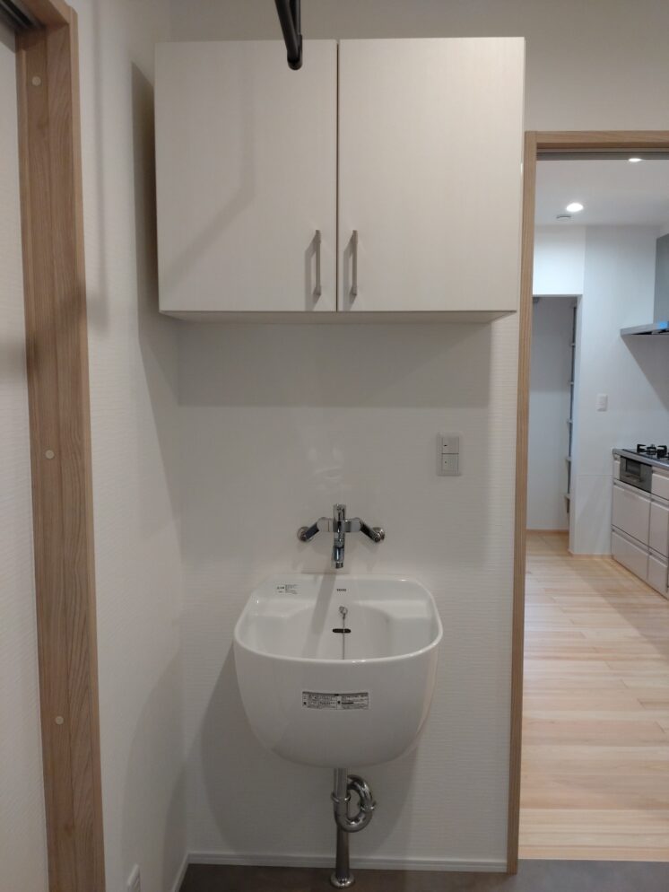 12月にお引渡しをした新築平屋建てのお住いは、ランドリールームにファミリークローゼットを併設した間取りでした。ランドリールームには、①常設のハンギングバー②ガス乾燥機の乾太くん③汚れ物を手洗い出来るスロップシンク(洗濯流し)+ファミリークローゼットを隣に併設しました。