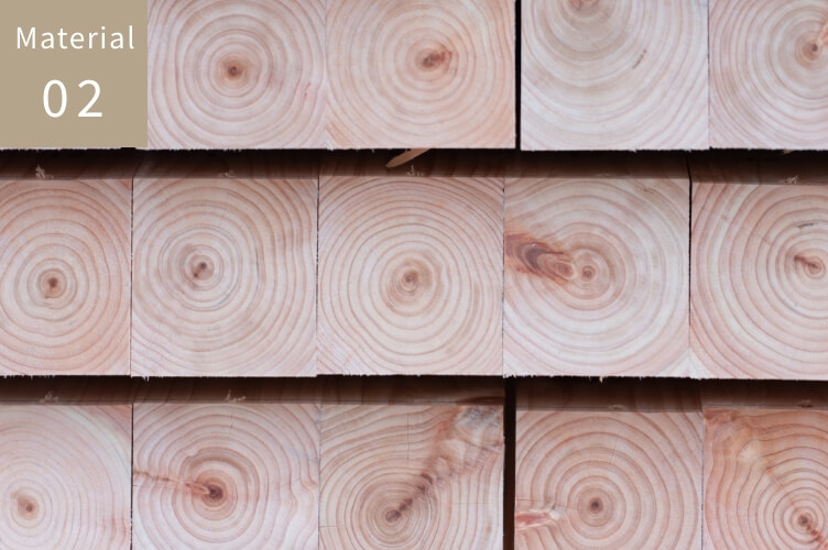 飛騨地方の寒冷な気候の中でゆっくりと育った飛騨杉は、年輪が詰まり、一般的な杉よりも高い強度を持つのが特徴です。また、他の樹種と比べると柔らかく温かな質感を持ち、塗装の仕上がりも美しい素材ですL.WORKSでは、この特性を活かし、構造材から外壁、フローリング、天井など、適材適所でその魅力を発揮するご提案をしています。