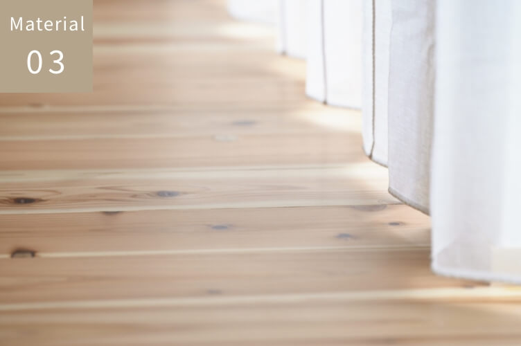 素足で歩くたびに、木のやさしい温もりを感じられる無垢フローリング。冬は冷たさをやわらげ、夏はさらりとした足ざわりで心地よく過ごせます。年月とともに艶を帯び、手をかけながら少しずつ暮らしに馴染んでいく素材です。小さな傷や色の変化も味わいとなり、時を重ねるほどに美しさを増す。靴を脱いで過ごす日本の暮らしに、自然と寄り添う素材です。